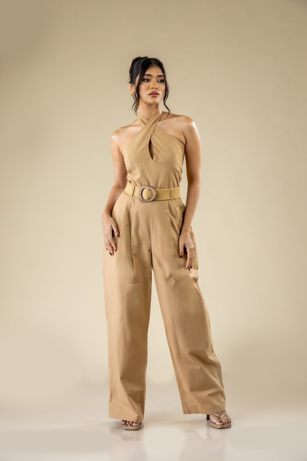 A refined, effortlessly chic jumpsuit designed with a crossover halter neckline and a subtle front keyhole detail that highlights the décolletage. The high-waisted wide-leg trousers create a long, elongated silhouette, while the tailored waist adds clean structure. Finished with functional side pockets and a back zip closure, it moves seamlessly from polished daytime wear to elevated evening styling.